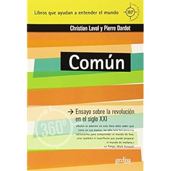 En su anterior libro La nueva razón del mundo, Christian Laval y Pierre Dardot explicaban como la sociedad actual ha llegado a este sistema económico y político basado en los principios más neoliberales que existen. Común, se entiende como una "segunda parte" donde los autores exponen sus propuestas, una vez analizado el sistema, y proponen una "revolución". Para Laval y Dardot las bases de la nueva economía deben destilar la esencia de la izquierda europea del s. XIX y XX pero pensando en las necesidades de la gente del s. XXI. Por ello, centran su discurso en estructurar una sociedad basada en lo común. Es decir, se debe reservar ciertas áreas consideradas comunes para que su gestión se haga de manera pública, y no por entidades privadas como ha permitido hasta ahora nuestro actual sistema neoliberal. Estamos hablando de necesidades básicas como el agua, la electricidad, la vivienda y los productos básicos de alimentación. En este amplio ensayo, los autores abogan por nuevas formas de democracia para conseguir derrocar los monopolios capitalistas.Tapa blanda=672 páginas. Editor=Gedisa; Edición: 1 (1 de mayo de 2015). Colección=360⁰ / Claves Contemporáneas. Idioma=Español. ISBN-10=8497848802. ISBN-13=978-8497848800. Valoración media de los clientes=Sé el primero en opinar sobre este producto. Clasificación en los más vendidos de AmazonTeoría económicaEconomíaPolítica=nº68.564 en Libros (Ver el Top 100 en Libros) .zg_hrsr { margin: 0; padding: 0; list-style-type: none; } .zg_hrsr_item { margin: 0 0 0 10px; } .zg_hrsr_rank { display: inline-block; width: 80px; text-align: right; } n.° 80 en Libros > Libros universitarios y de estudios superiores > Negocios y finanzas > Economía > n.° 1096 en Libros > Economía y empresa > n.° 1381 en Libros >.